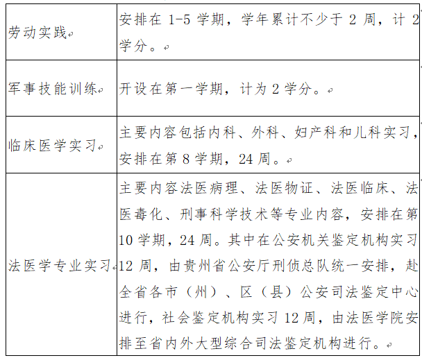 第一课堂要求242学分,其中必修课165学分;个性发展平台选修课15学分;通识教育选修课12学分;集中性实践教学50学分:包括毕业实习(临床实习)24学分、毕业实习(专业实习)24学分、军事技能训练2学分。全部实验和实践教学环节占总学分的47.3%。
