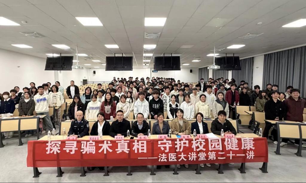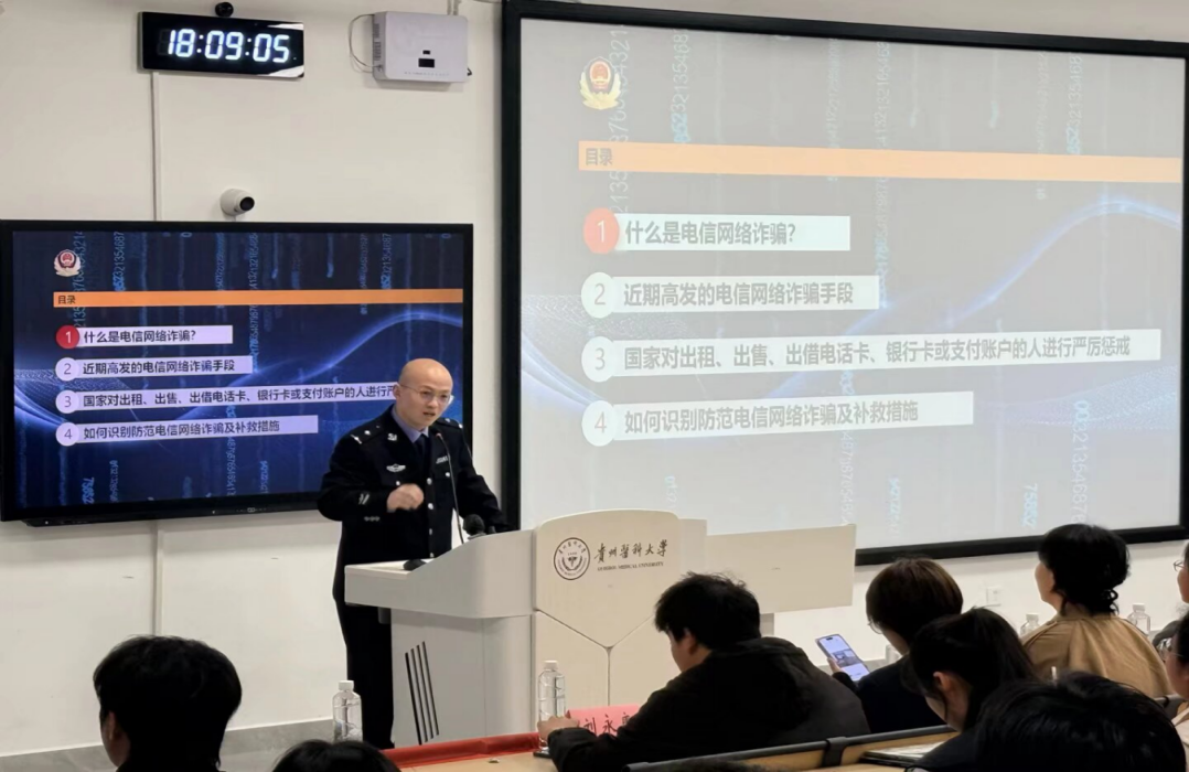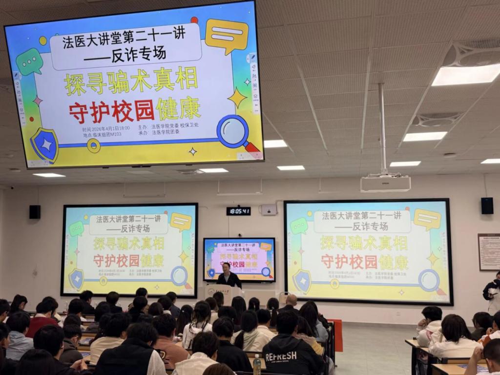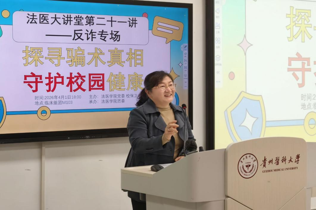 为筑牢校园反诈安全防线,提升师生防骗识骗能力,4月1日,由法医学院党委、校保卫处主办,法医学院团委承办的“法医大讲堂”第二十一讲——反诈专场活动,在临床组团M103教室顺利举办。本次活动以“探寻骗术真相,守护校园健康”为主题,特邀黔西南州公安局反诈骨干、法医学院2021届毕业生李淳警官主讲。保卫处处长陈秋、法医学院党委书记封韬、校团委副书记胡洪瑞、法医学院党委副书记杨晖、法医学院正科级组织员张佳佳、保卫处内保科刘永康等教师代表以及法医学院2024级、2025级同学参与活动,活动由法医学院团委副书记季晶焱主持。
